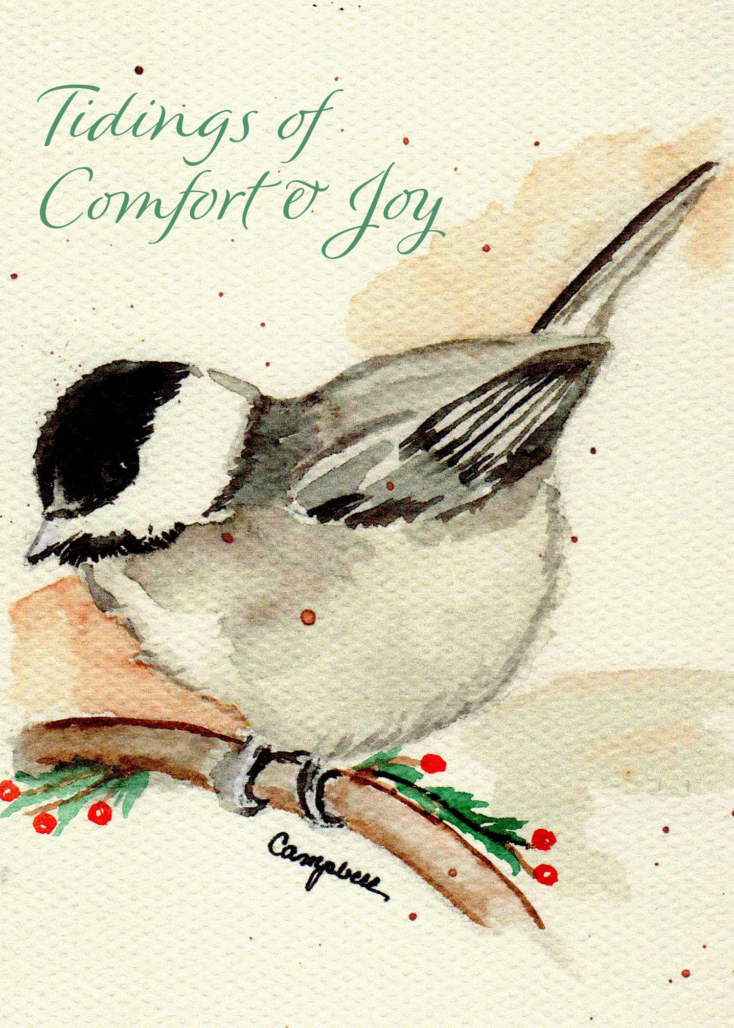 Celebrate the season with this elegant holiday card, featuring an original watercolor painting by local artist Tammy Caudill. The artwork beautifully captures two Pine Warblers perched among the vibrant branches of a native Holly tree. This image is rich with meaning and regional significance.