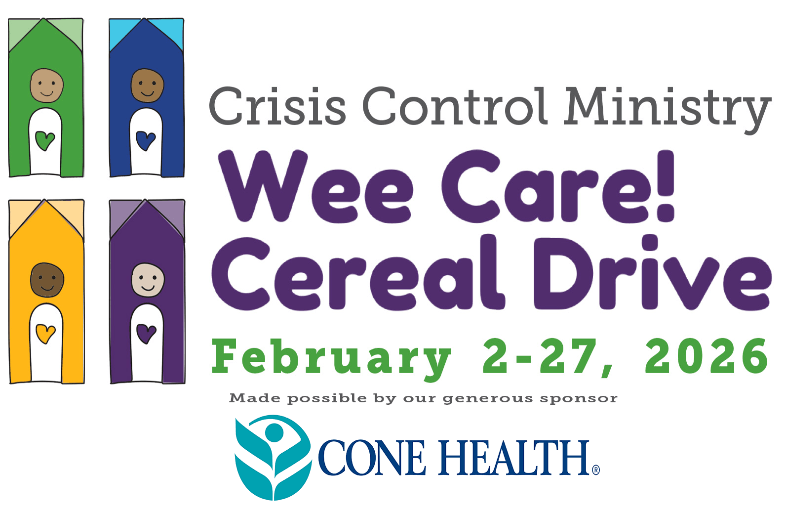 Children across Forsyth County are joining the FUN and LEARNING ABOUT HELPING THEIR NEIGHBORS! During the month of February, daycare centers, preschools, elementary schools, and other organizations are participating in Crisis Control Ministry's Wee Care! Cereal Drive. Wee Care! is a program designed to educate preschool and elementary school-age children about the importance of good nutrition while encouraging them to give to support their local community. The donated cereal will be distributed in the Crisis Control Ministry Winston-Salem and Kernersville client-choice food pantries to hungry families experiencing financial crises. Last year, 71 participating schools donated - nearly 10,000 pounds, which is more than 161,000 servings! Because of this support, not only were we able to provide more than 1,560 households with cereal, but we were also able to share cereal with community partners, including the Winston-Salem Forsyth County School System and Forsyth County Department of Social Services.
